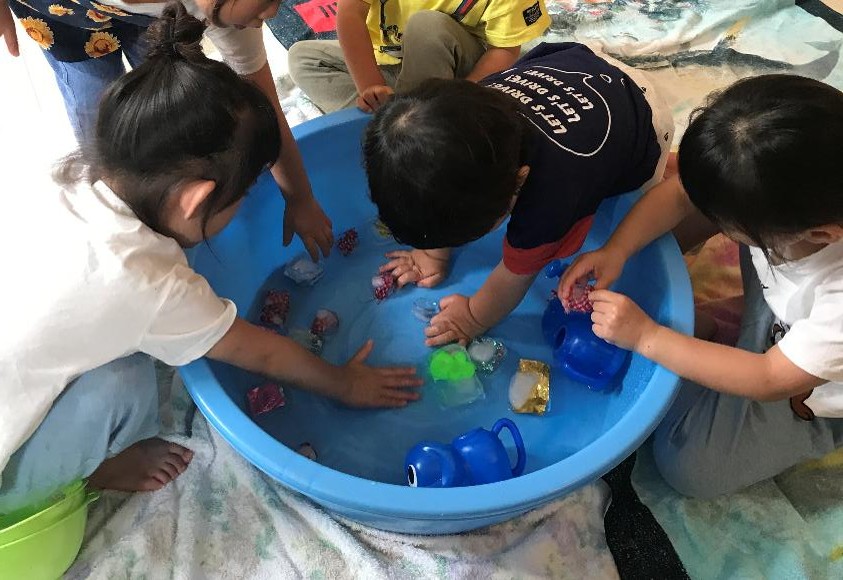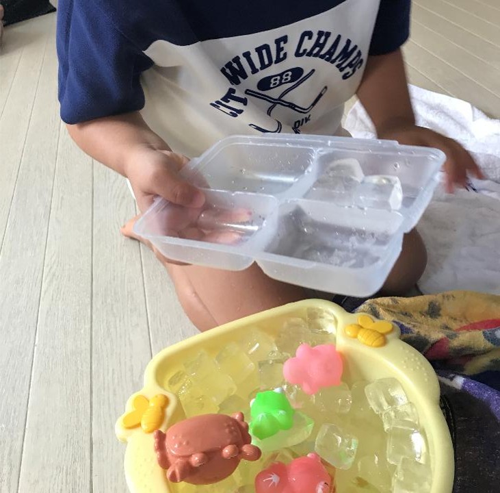 冷たーい氷遊びはみんな大好き!バケツにアイスキューブを集めたり、じょうろで水をかけて溶かそうとしたり、飽きることなく遊んでいます。