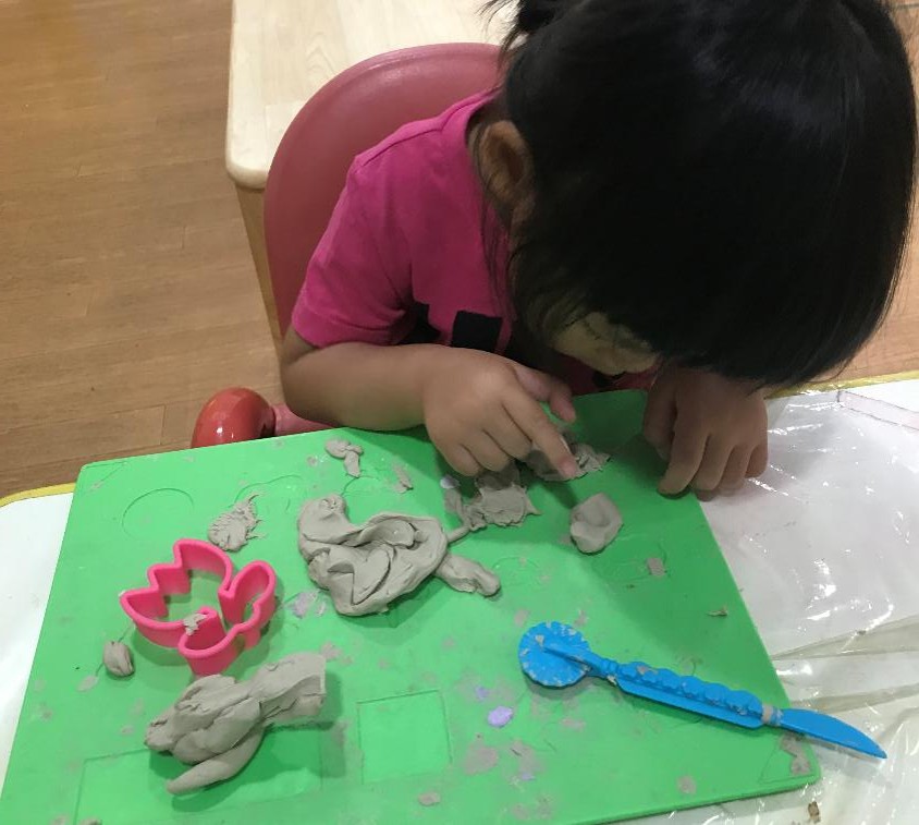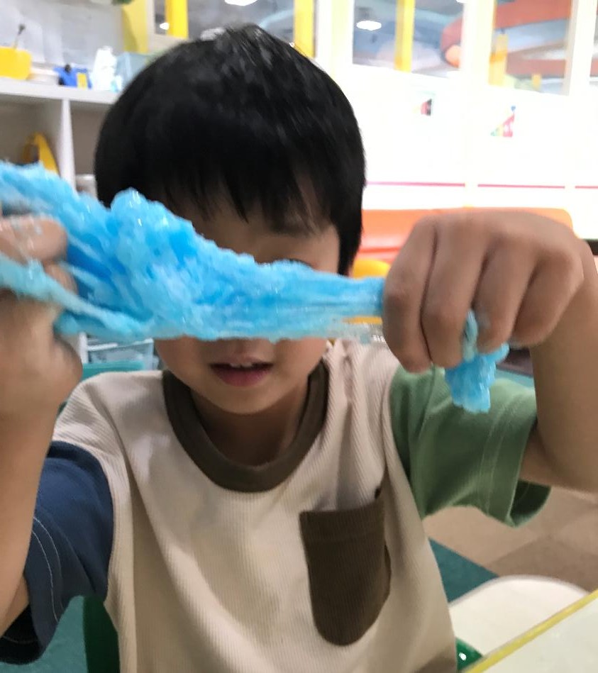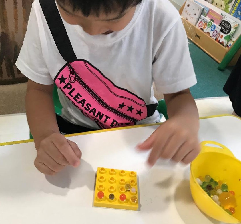 他にも、定番の油粘土や、見た目もかわいいウォータービーズ、手作りスライムなど、色々な感触に触れています。