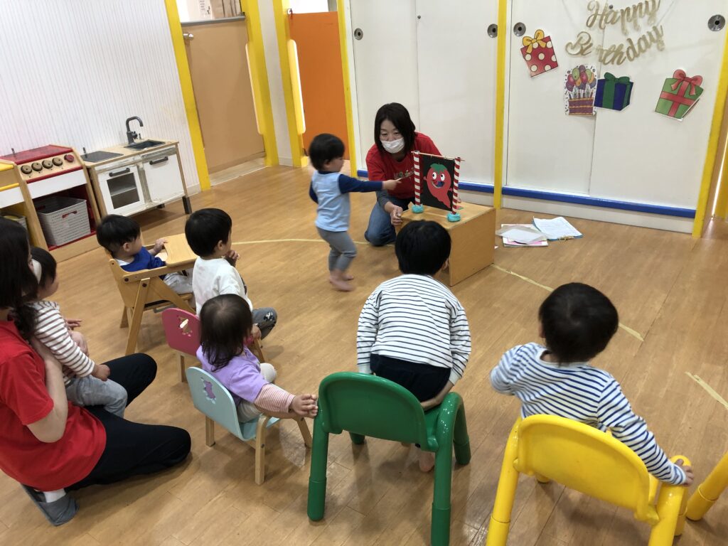 4月生まれのお友だちのお誕生日会をしました。みんな夢中になってペープサートを見ています!